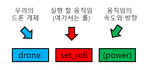 인수(Argument): 함수가 호출될 때 사용자가 함수에 넣는 실제 값입니다. 예를 들어, 코드 drone.set_roll(25)