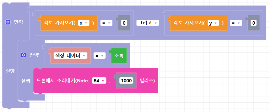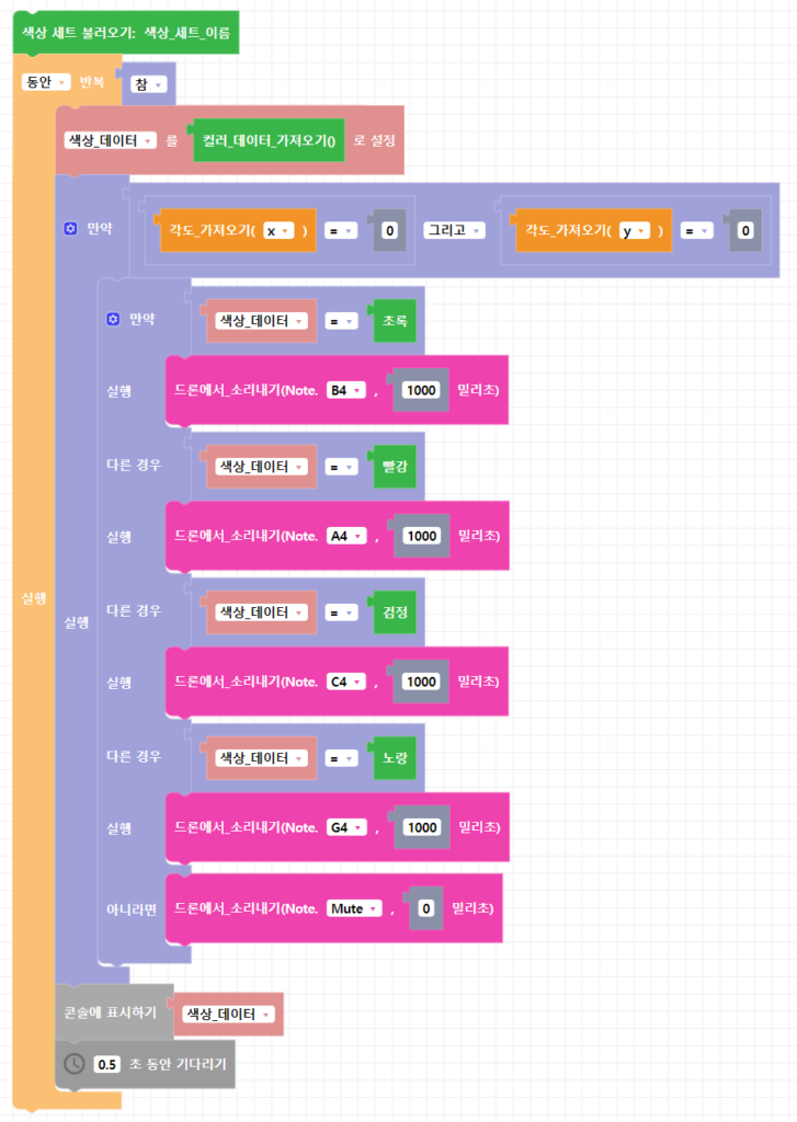 다음으로, 여러분의 드론이 지속적으로 색상을 찾을 수 있도록 무한으로 반복하는 while 반복문을 생성합니다. 이 while 반복문의 내부에서는 현재 색상 데이터를 가져와 코드론 EDU가 이전 색상 데이터와 비교하며 어떤 색상을 보고 있는지 예측하도록 해야 합니다.
