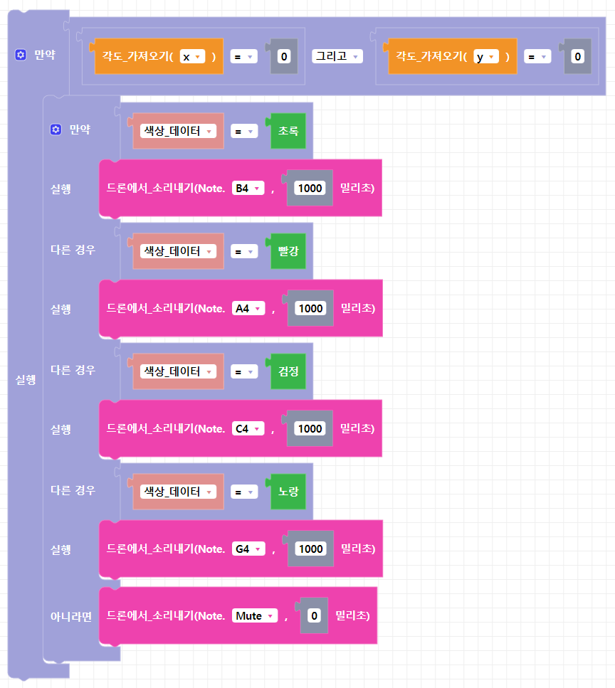 변수를 사용합니다. 색상이 녹색이면 B4 음계를 1초 동안 재생합니다.