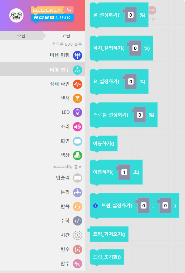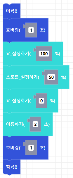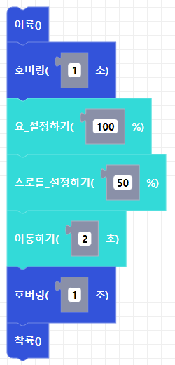스로틀 (THROTTLE) 은 코드론 EDU의 수직 또는 상하 이동을 제어합니다. 양(+)의 스로틀 값은 코드론 EDU가 더 높게 비행하고, 음(-) 스로틀 값은 코드론 EDU가 더 낮게 비행합니다.