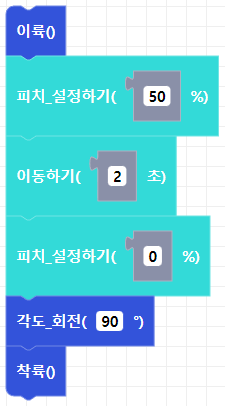 피치 (PITCH)는 코드론 EDU를 앞, 뒤로 움직이게 합니다. 양(+)의 피치 값은 코드론 EDU를 앞으로 기울여서 움직이게 하고, 음(-)의 피치 값은 코드론 EDU를 뒤로 기울여서 움직이게 합니다.