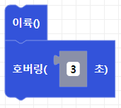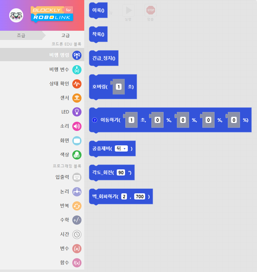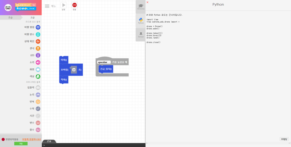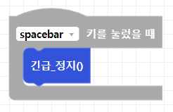 다음으로, 비행 명령 메뉴로 가서 긴급 정지 블록을 찾은 다음, _키를 눌렀을 때 블록에 드래그 합니다.