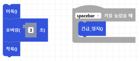 코드론 EDU가 충돌하기 전에 착륙하기를 원한다면 작업 영역에서 멈춤 버튼을 사용하면 됩니다. 회색의 입출력 메뉴에서 _키를 눌렀을 때 블록을 작업 영역으로 드래그하여 정지 스위치를 프로그래밍 할 수도 있습니다. 이것은 왼쪽에 다른 블록과 연결할 수 없는 단독형 블록입니다. 블록의 드롭다운 메뉴에서 드론을 멈추는 데 사용할 키를 선택하세요. 하지만 백스페이스 키를 사용하면 코드 블록이 삭제될 수 있으므로 사용하지 말아주세요. 스페이스바(spacebar) 키가 누르기 쉽기 때문에 이것을 사용하는 것이 좋습니다.