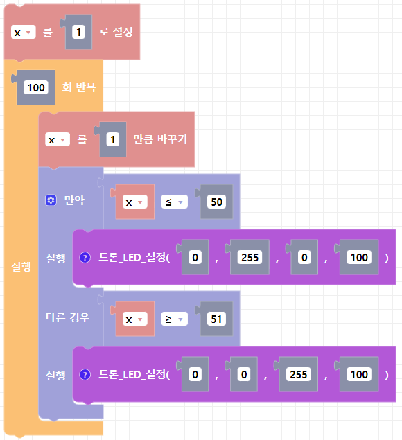 100처럼 큰 숫자를 반복하는 이유가 궁금하신가요? 컴퓨터는 매우 빠르게 셀 수 있으므로 대기 블록 없이 더 작은 숫자를 사용하면 코드론 EDU의 LED가 매우 빠르게 변경되어 확인하기가 어렵습니다.