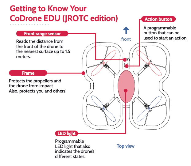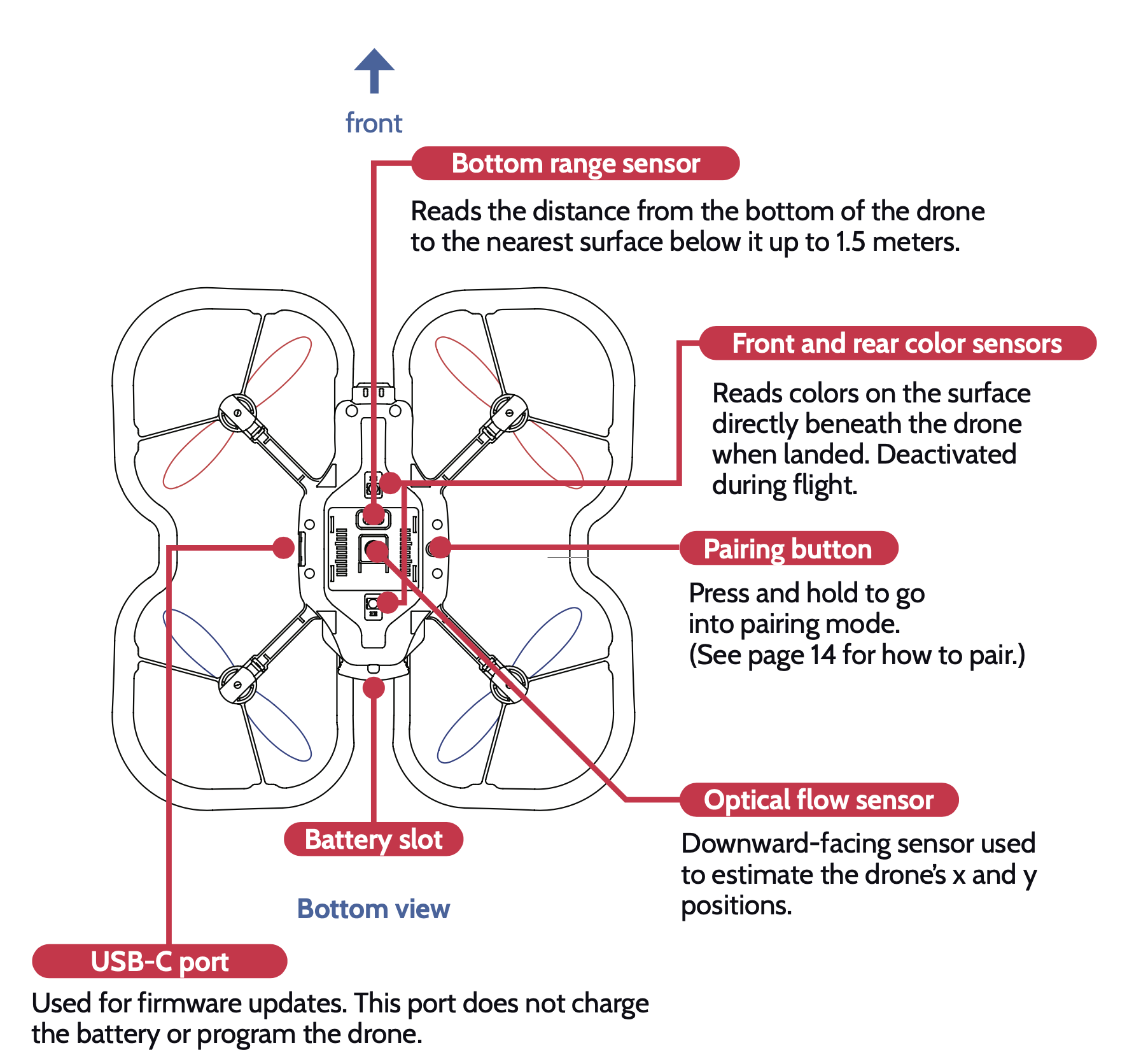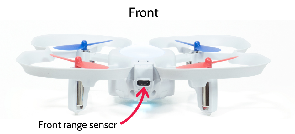 The bottom color sensors read the amount of red, green, and blue light reflected from the surface underneath. In the lesson on the color sensor, you will learn how to calibrate the sensor to detect any color you want! This sensor is deactivated during flight.
