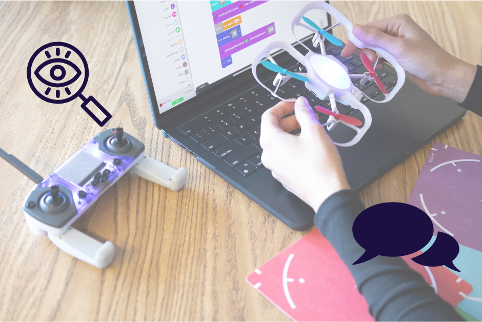 The optical flow sensor helps the drone estimate its position relative to where it took off. This sensor is similar to the one on the bottom of your computer mouse! It senses pattern changes on the surface to calculate how far it has traveled.