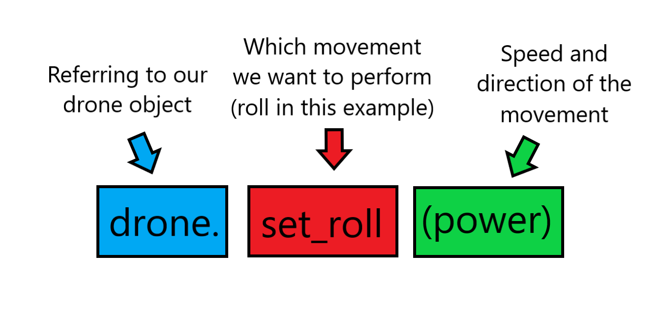 As you see in the image above, each of the movement commands follows the same format. You specify the drone object that you want to move, tell it which of the movement commands to do, and then specify what direction and speed you want the movement to occur. When setting the speed and direction, you put into the commands an argument value ranging from -100 to 100. The values 0-100 are the percentage of the drone’s power you want to use. 0 would be no power while 100 would be full power (100%). Whether the argument value is positive or negative determines the direction the drone will take. For example, -50 and 50 will move at the same speed but in opposite directions.