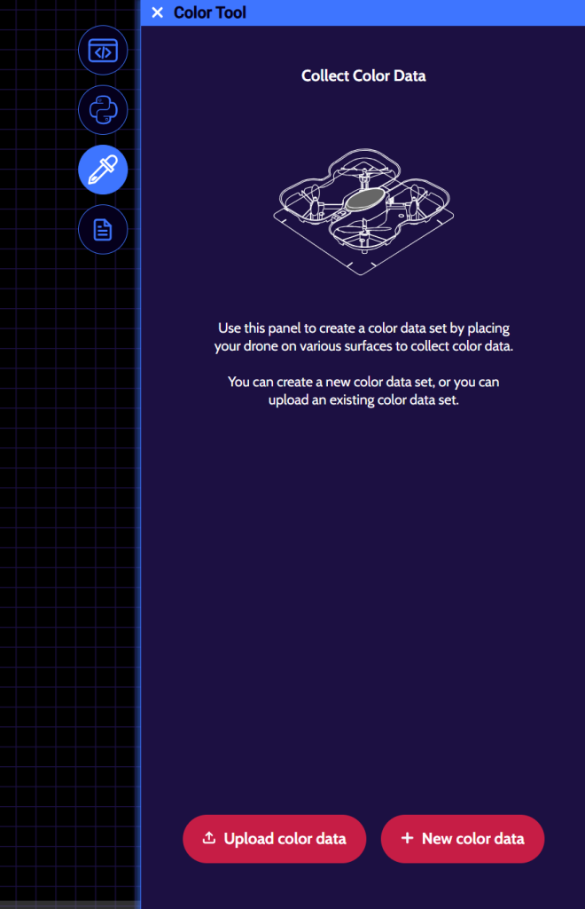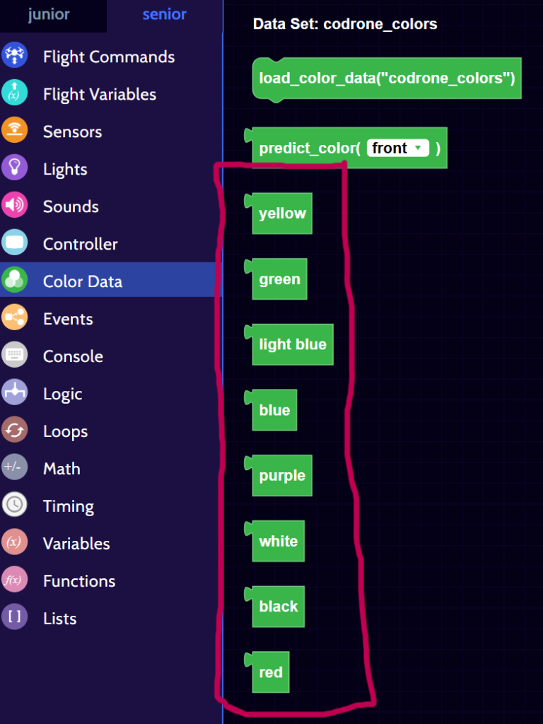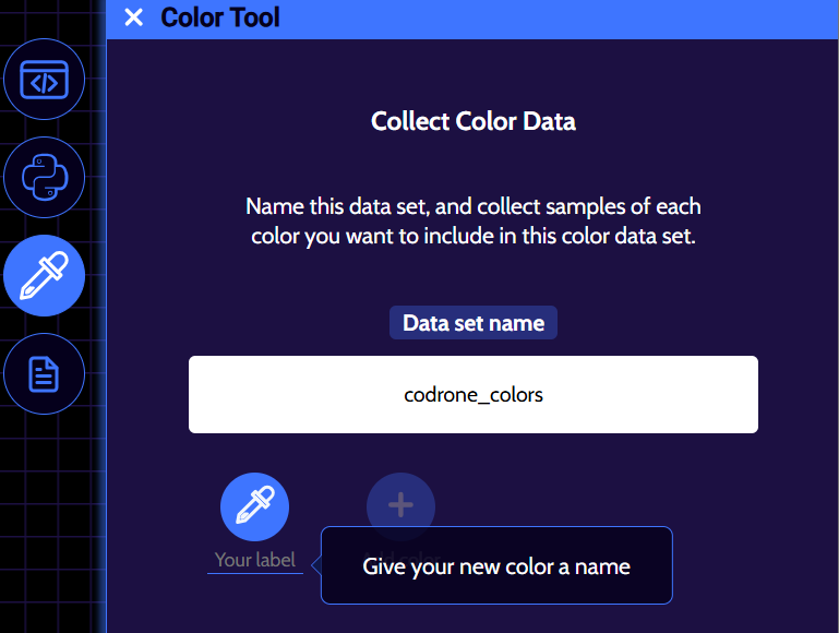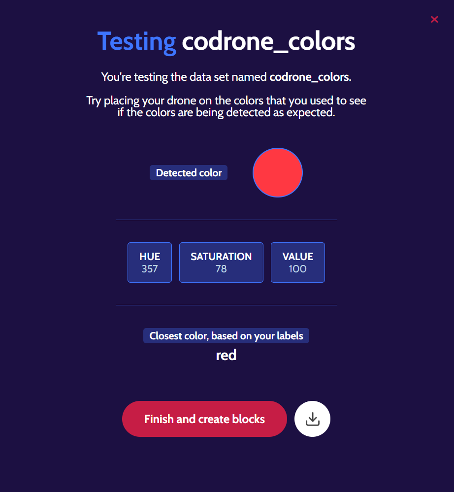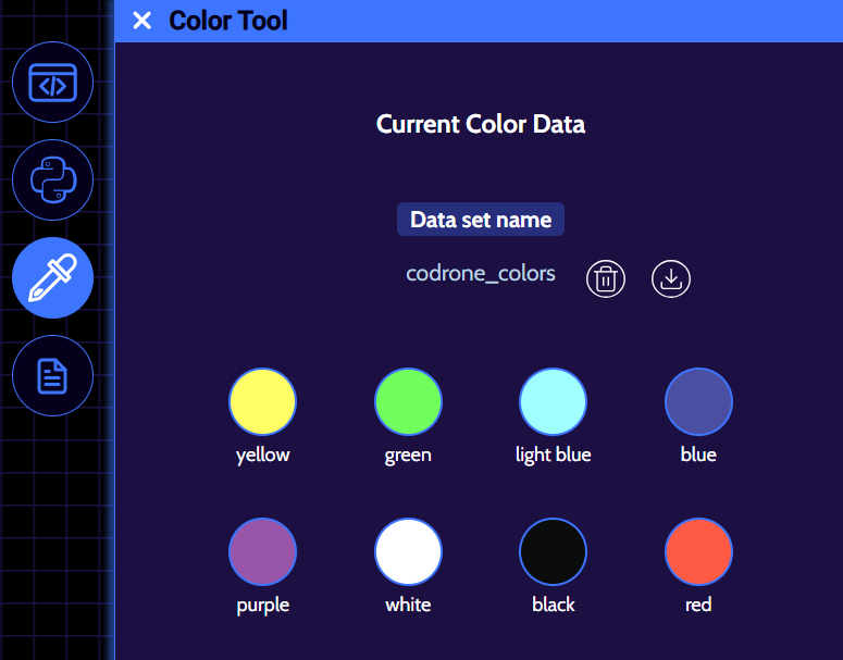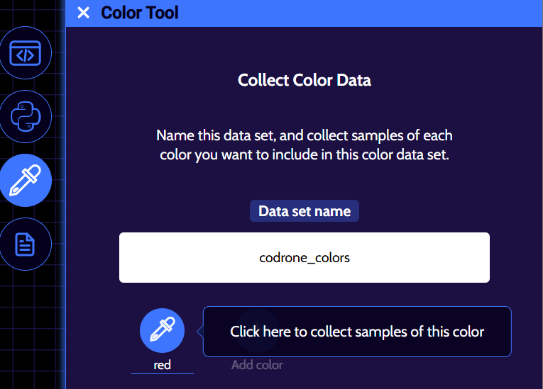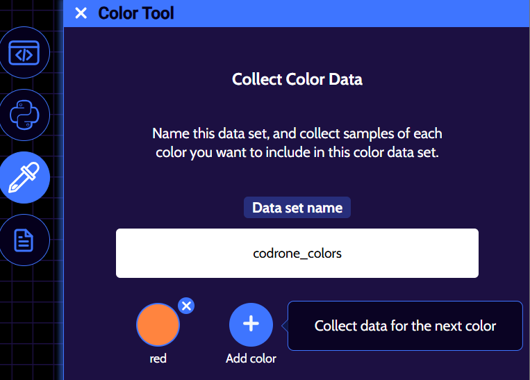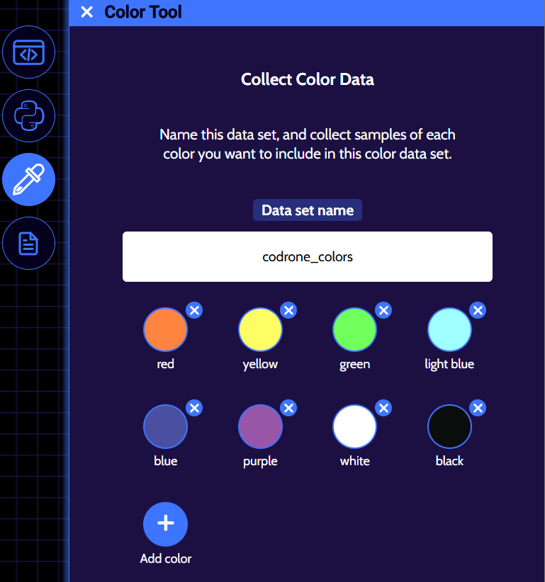 If you’re unhappy with how a color turned out, you can click on the ‘X’ button that’s next to one of the colored circles to remove it from your color data set and simply add a new color with the same name. For example, the ‘red’ color data that we collected didn’t look red, so the ‘red’ color was removed and was redone. Remember, if all of your colors aren’t coming out the way that they’re supposed to, head to this lesson to re-calibrate your drone’s color sensors!