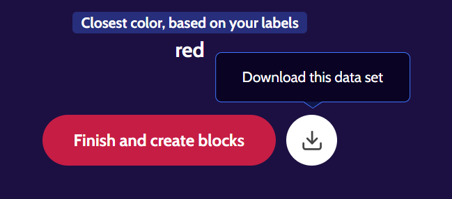If you forget to download your color data set, don’t worry! There’s a download button that will appear on the top-right side of the color training tool. Right next to the download button, there’s a trash can icon to remove the existing color data set and depopulate the “Colors” category.