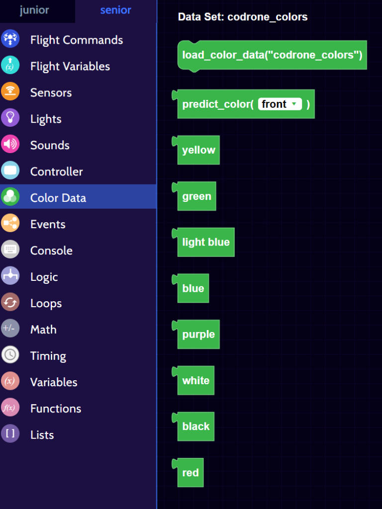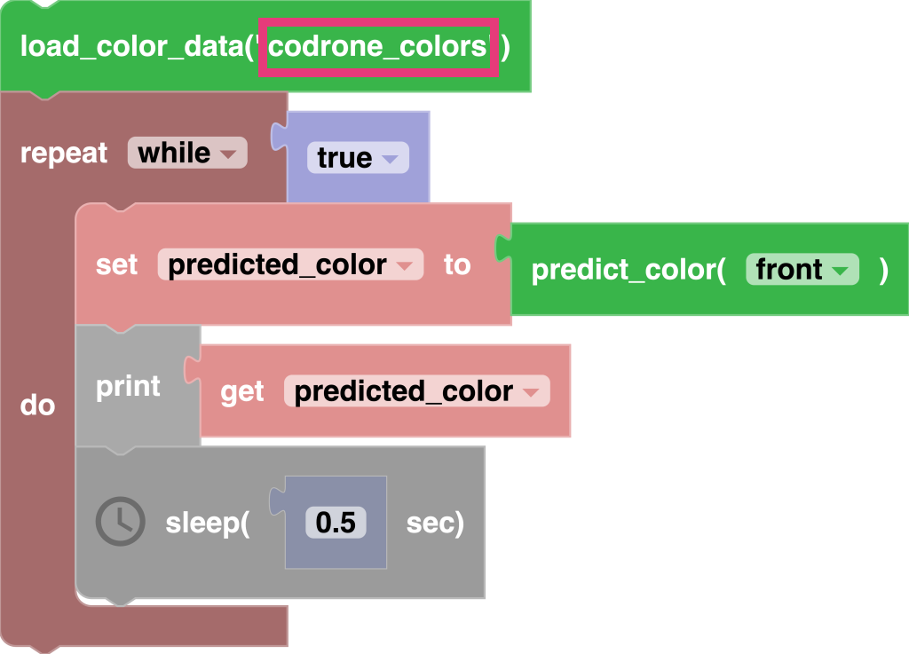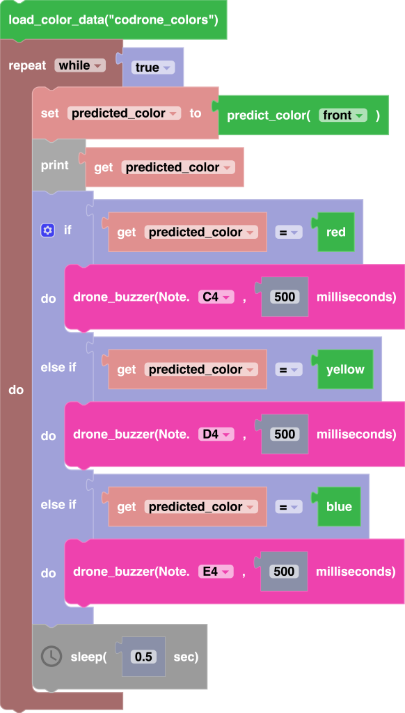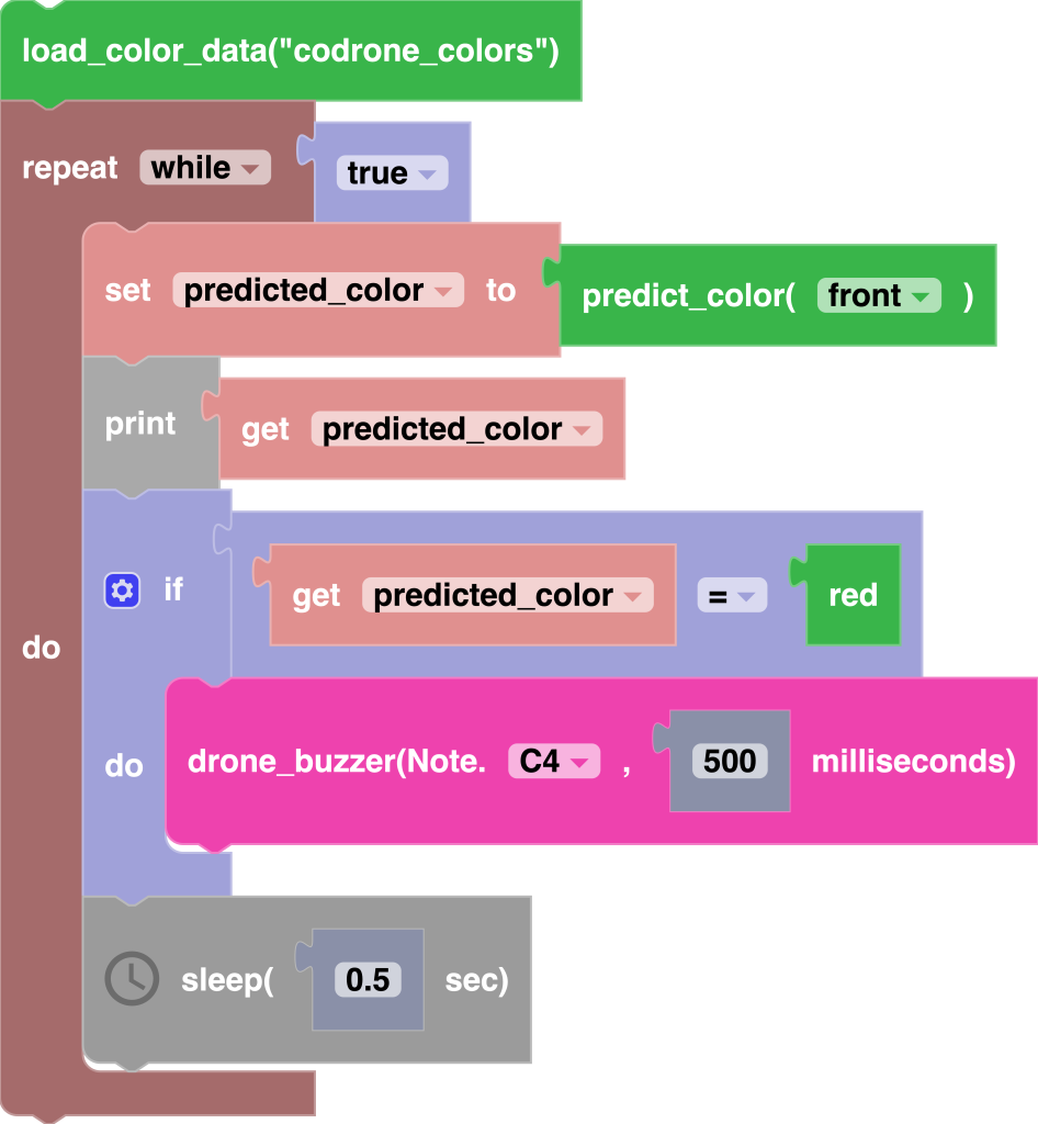 Additionally, if you were to place the drone on a surface that wasn’t used in the training phase, during the testing phase, Blockly will give you its closest guess on what the name of the detected color is.