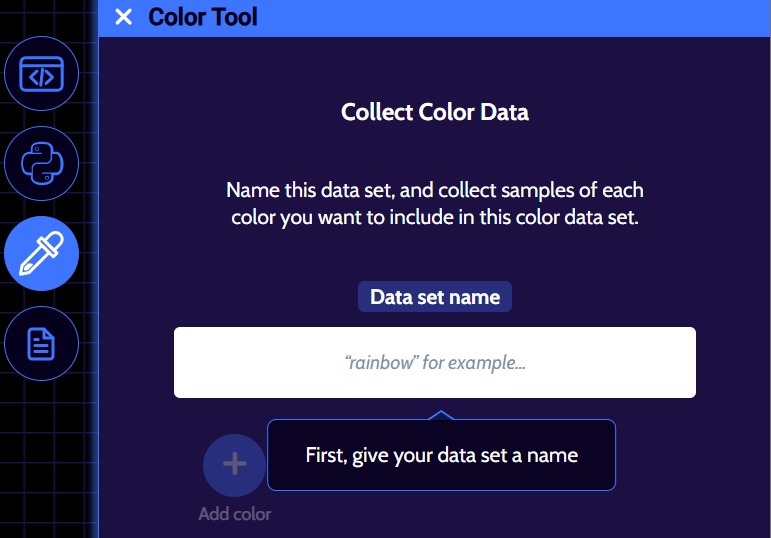The color training tool will prompt you to add a color to your data set by clicking the ‘+’ button.