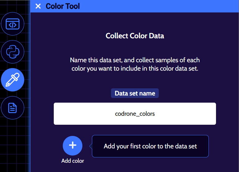 Click on the circular icon that is on the right side of Blockly to open the color training tool. Next, click on the New color data button to start color training process.