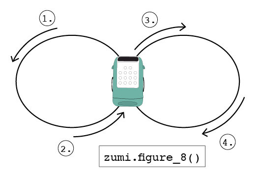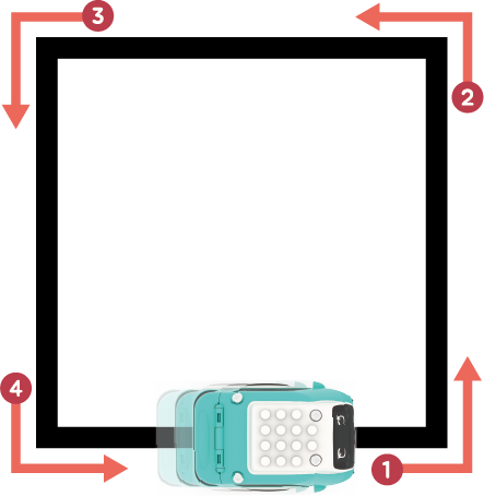 It’s time for your first challenge! Using what you know so far, program Zumi to drive in a square around the block. Remember, a square has four sides all the same length and right angle turns. You can use either all right turns or all left turns. If you are stuck, take a look at image below. When you’re done, scroll down to see the solution.