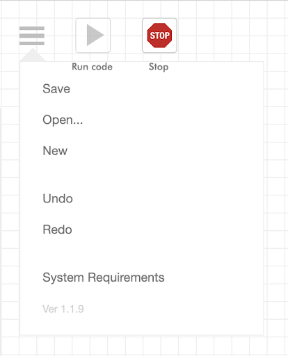 Make sure you save! You can do this by going to the menu in the upper lefthand corner of the workspace and clicking on “Save”. To open a saved program, go to the same menu and click on “Open…”.