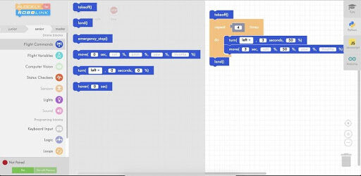 To write your code, drag blocks from the menus on the right to the workspace in the middle of the page. If you want your CoDrone to fly, you need to include takeoff and land blocks from the flight commands menu.
