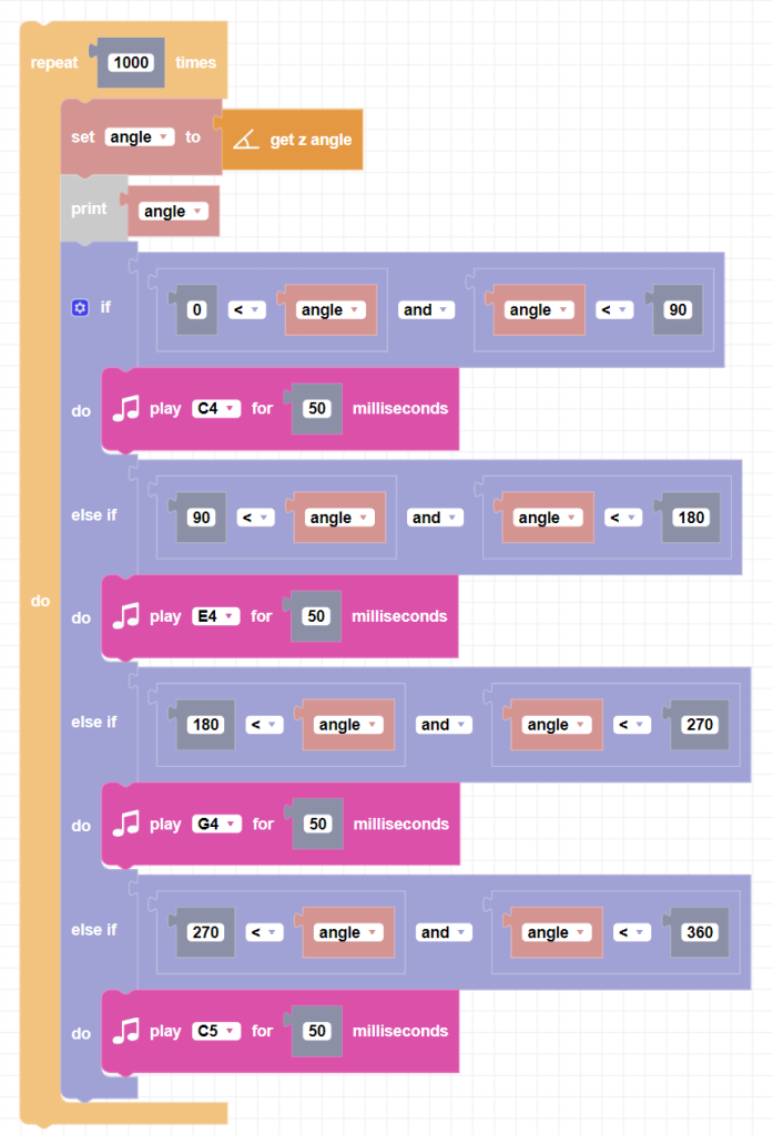 NOTE: Notice, once again, that if you turn Zumi to the right, the values read by the gyroscope are negative. Therefore, the sounds will not play. If you turn it left more than a full 360°, the gyroscope will read angles larger than 360, and the buzzers will not play any notes. Look at the console for the printed values as you turn Zumi to figure out which notes should or should not be playing!