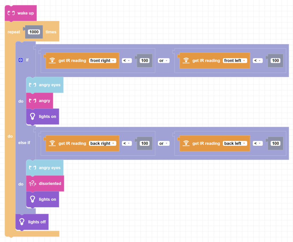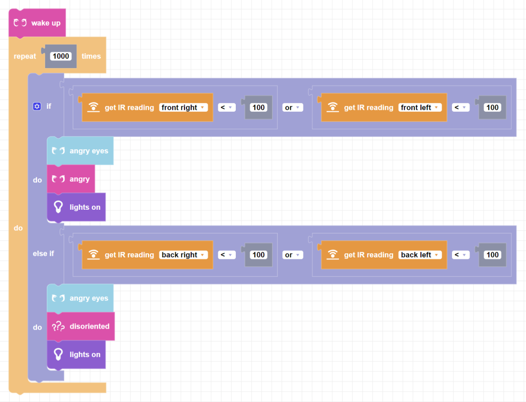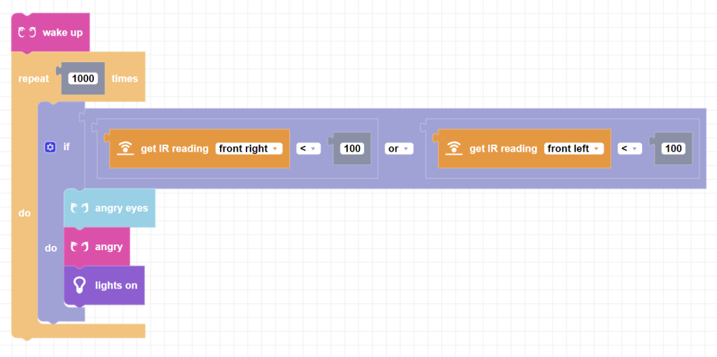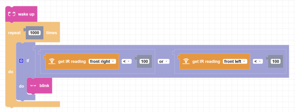 In the example above, you notice the values go down to around 20 when the sensor is covered, and will be around 220 when the sensor is left uncovered. Your values may not exactly match these ranges. Everyone’s sensors are slightly different. The lighting in the room can also affect the values. If you are still getting some strange readings, make sure the IR sensors are not bent out of shape.