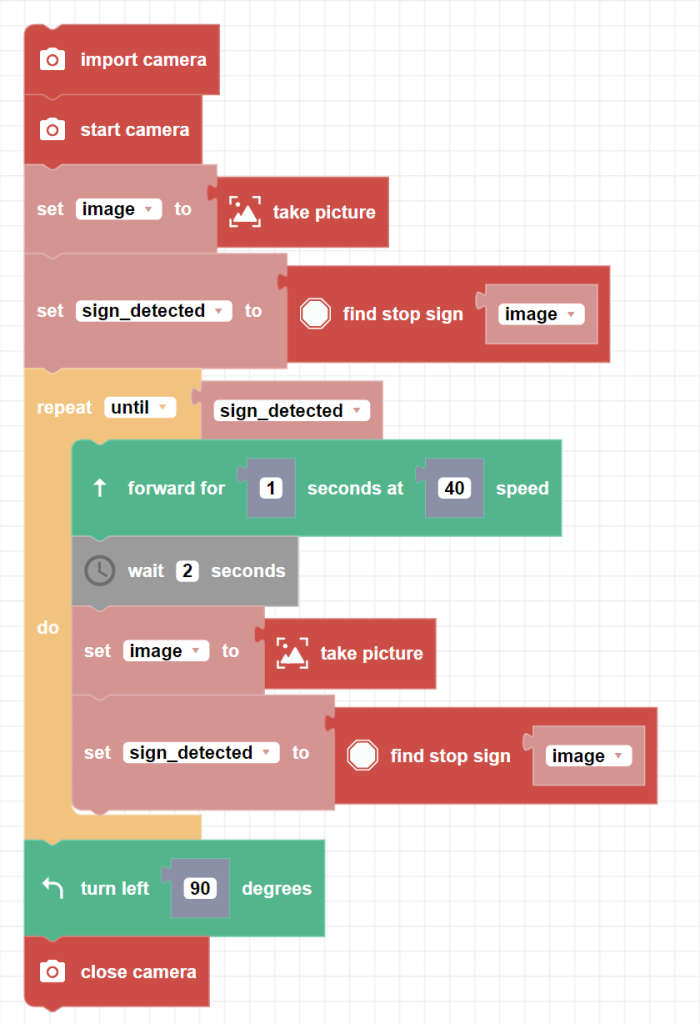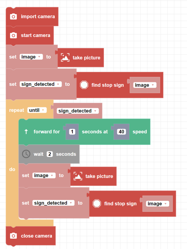 Combining our new knowledge of the until loop with the camera code, we can ensure that Zumi will only go forward until she sees a stop sign. Include a wait block so that Zumi can be still as she takes her picture. If she does not see a stop sign, she moves forward for 1 second at 40 speed (you can change this if you want!) and takes another picture to see if she sees a stop sign now.
